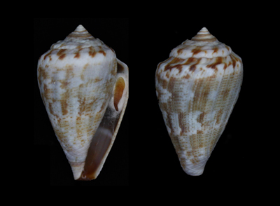 Conus (Lautoconus) ventricosus Gmelin, 1791 Collected during low tide on muddy sand on exposed sea grass beds;Olhão, Algarve, Portugal; 2014