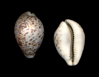 Cypraea tigris Linnaeus, 1758 Netted by fishermen between 25 to 35 meters depth; Off Keelakarai, Tamil Nadu, India; January 2013